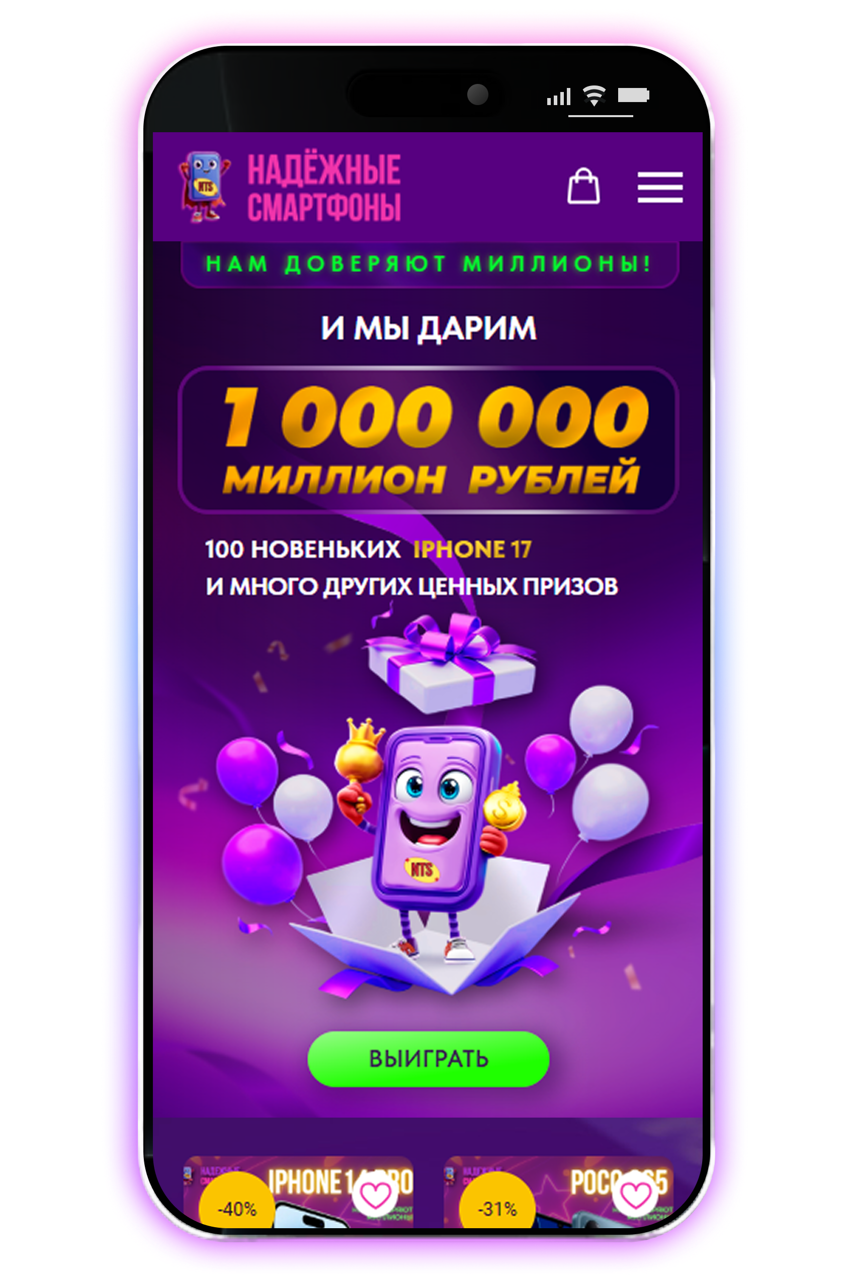 «НАДЕЖНЫЕ СМАРТФОНЫ» — это федеральная сеть, специализирующаяся на продаже и обслуживании мобильной техники, аксессуаров и ремонте гаджетов. Мы работаем на рынке с 2022 года и за это время заслужили доверие более миллиона покупателей благодаря прозрачным условиям, качеству и доступным ценам.